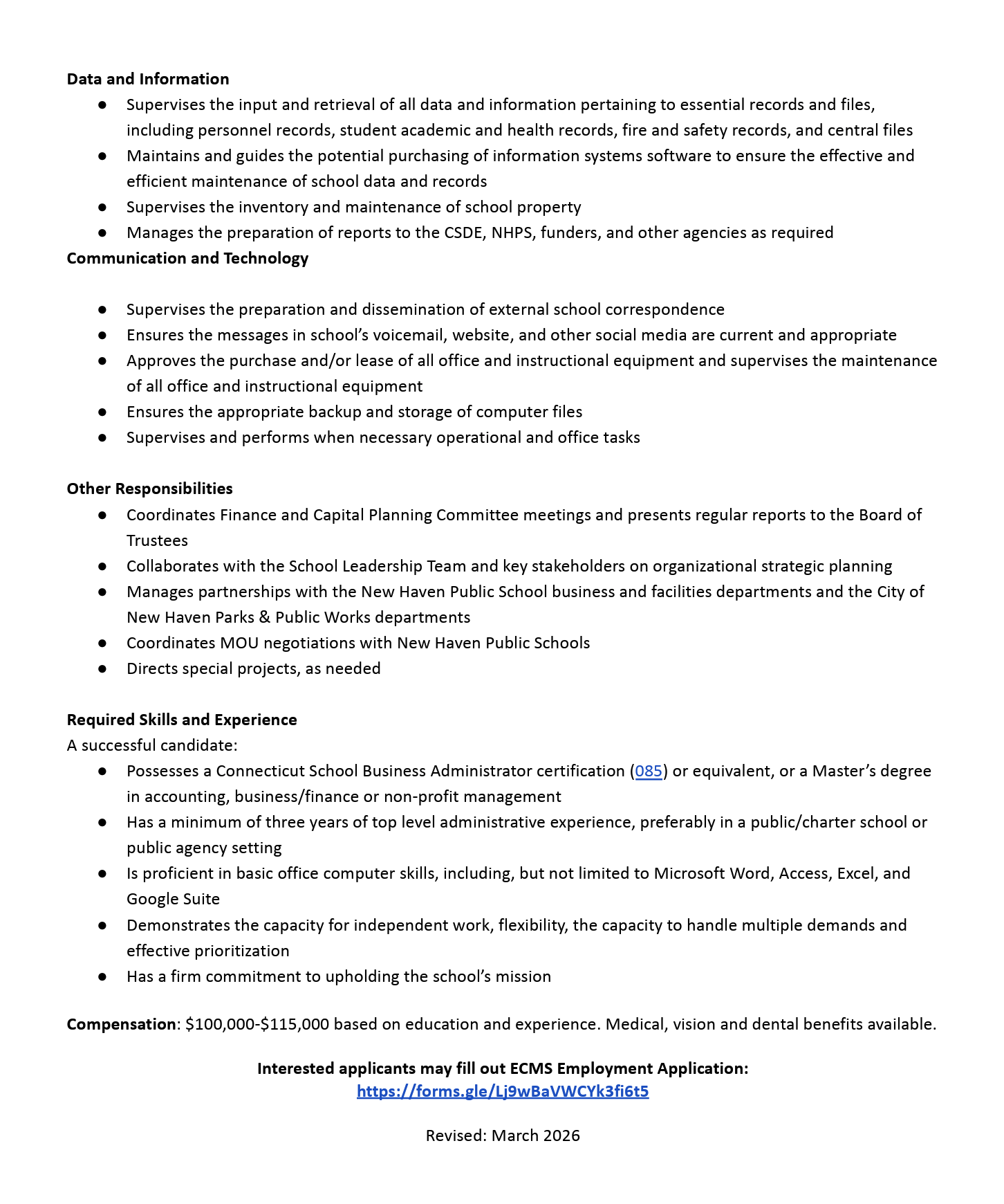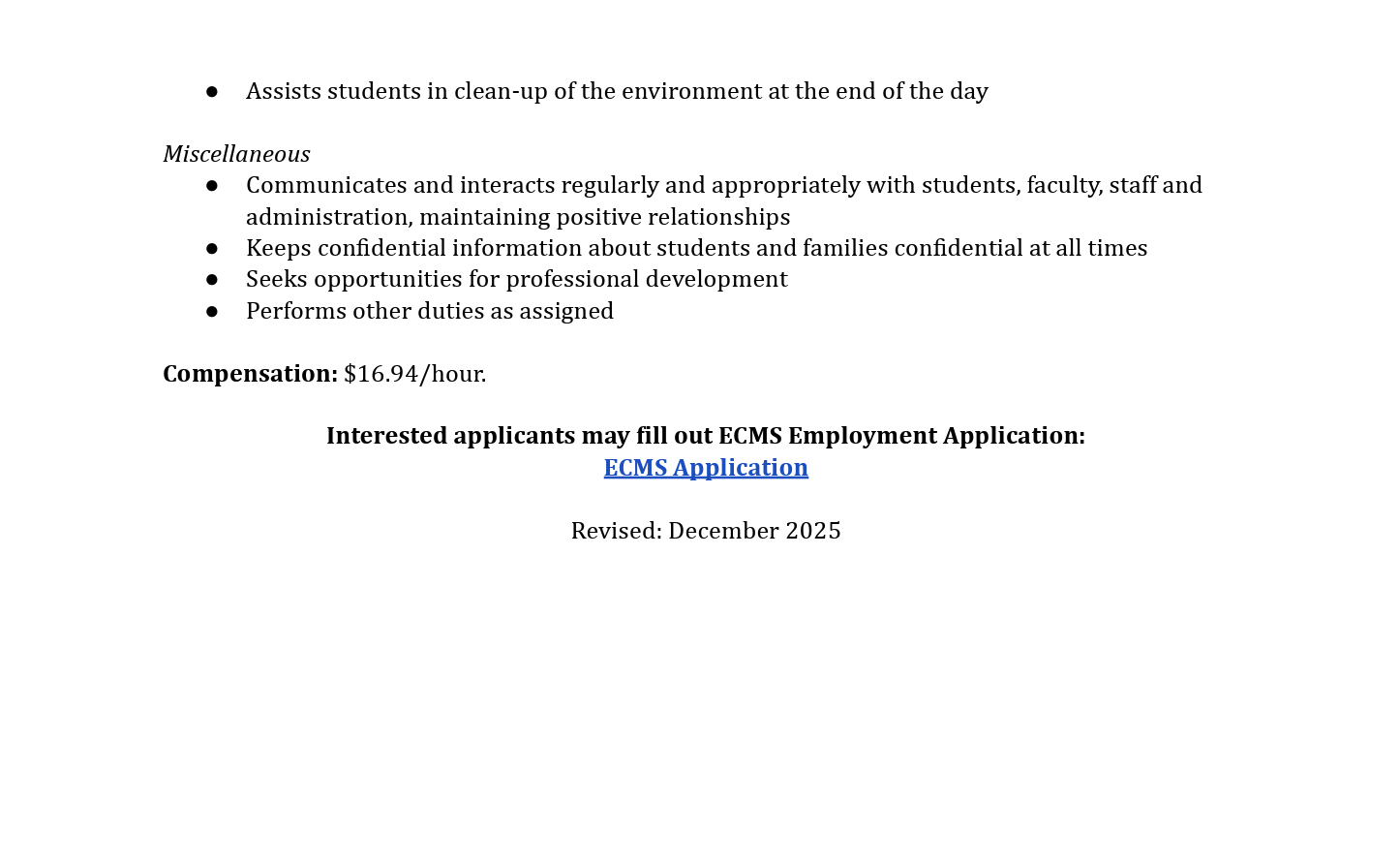 Interested applicants may fill out ECMS Employment Application: ECMS Application