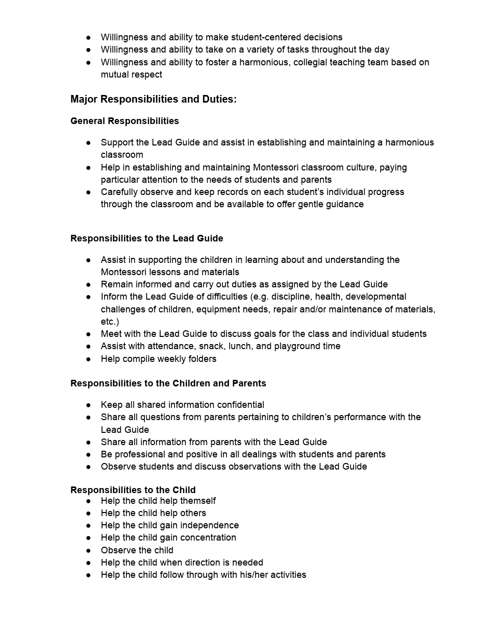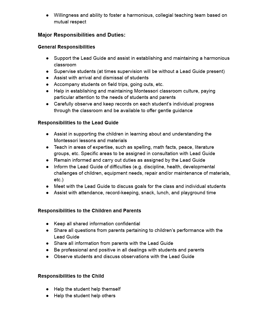 Candidates must have a B.A. degree and teaching experience with school-age learners, good communication skills, and a desire to work as a collaborative teammate. A Montessori credential and experience is a must. Candidates must be authorized to work in the U.S.