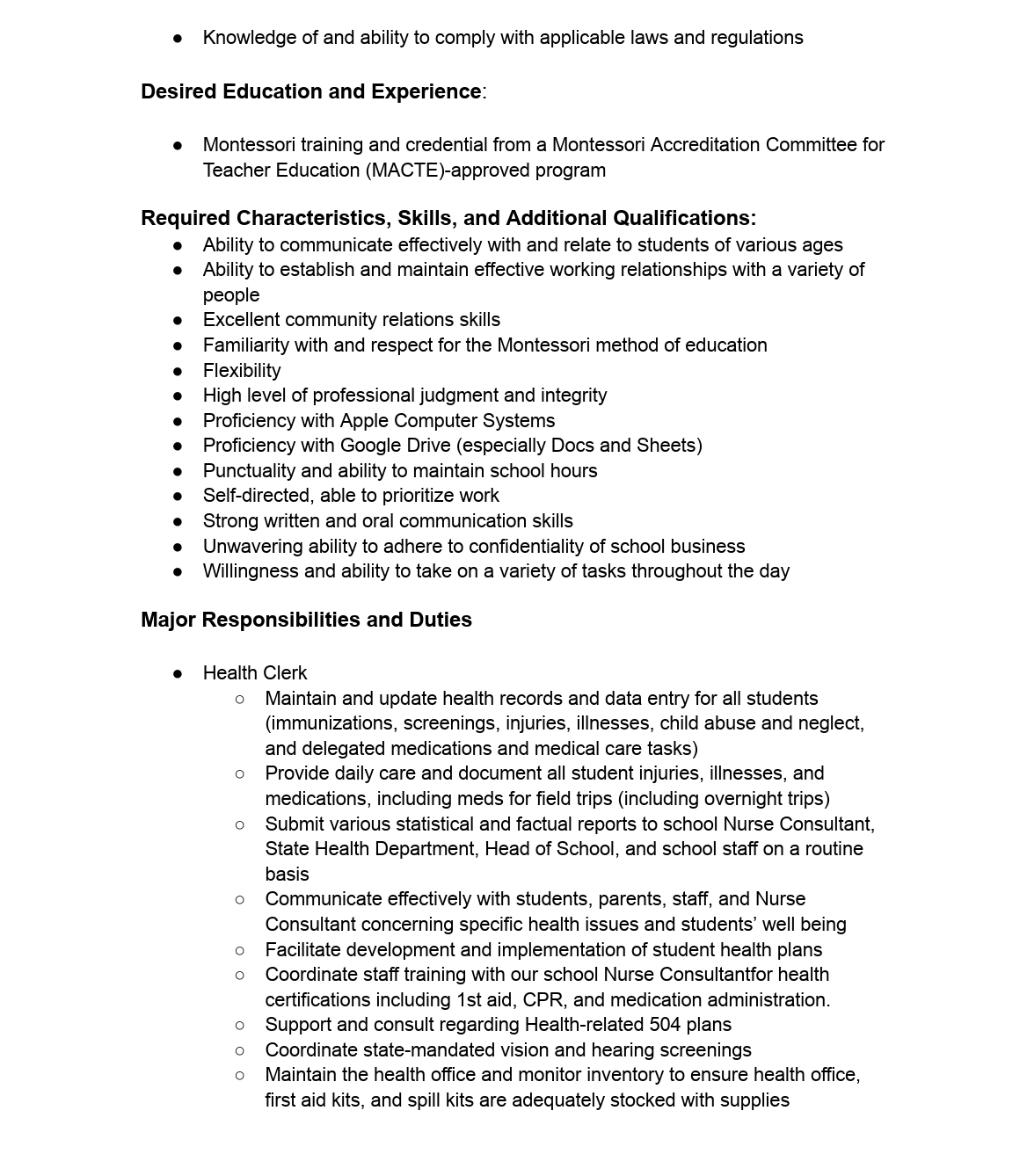 Additional qualifications such as experience in journalism, creative writing, linguistics, or higher education teaching are advantageous; private school experience or Montessori certification is highly desirable. Join us to make a meaningful impact on young learners’ lives by fostering their curiosity about the world while nurturing their academic talents within a supportive Montessori community!