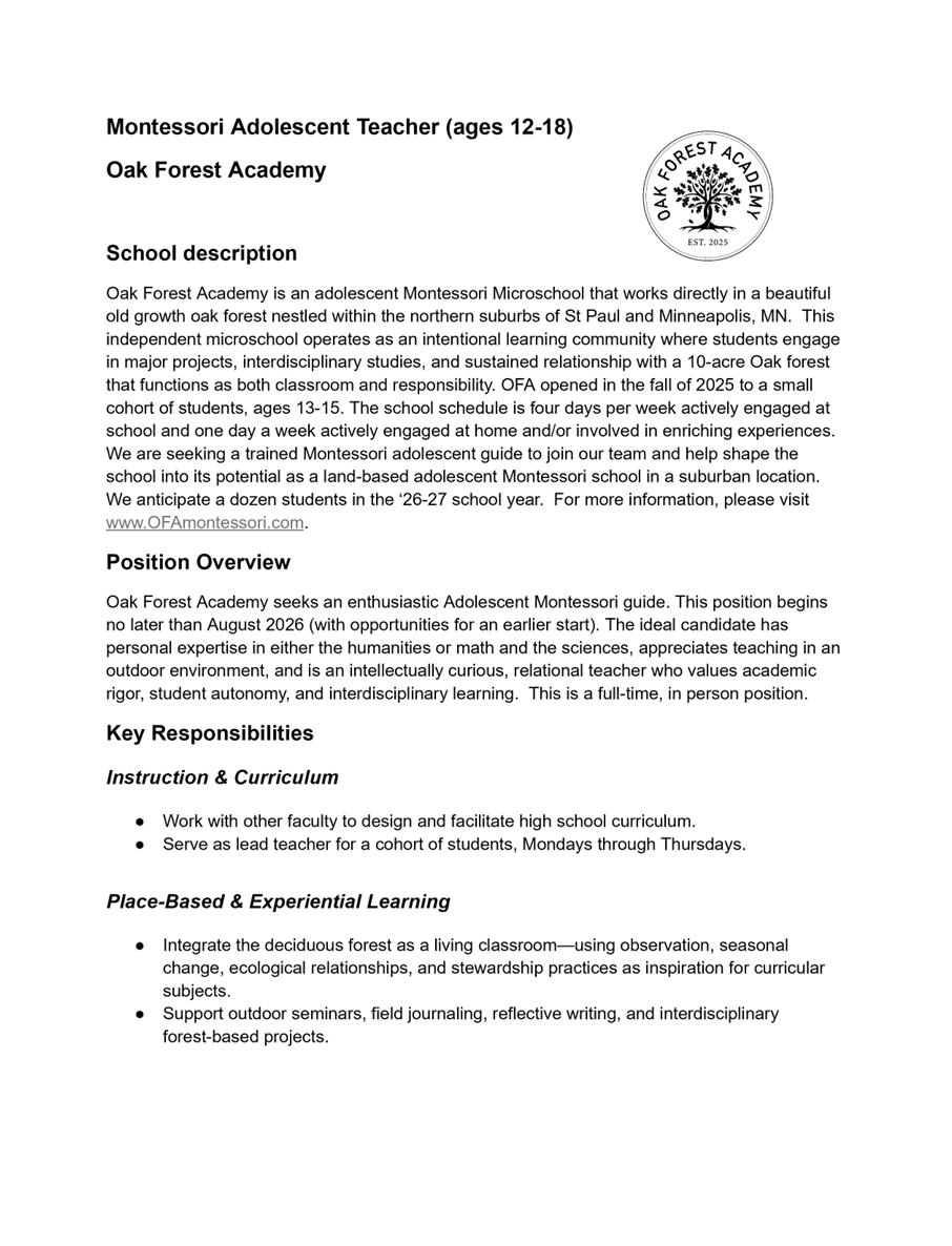 January 21, 2026 - Chesapeake Montessori School - Adolescent Teacher - Maryland, USA